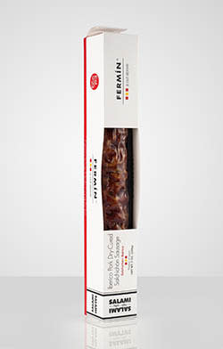 A u niqu e p rod uc t o f s ing ul ar j uic ine ss and de lic at e flav or, se a sone d wit h n ut me g , blac k an d wh it e pe ppe r. S imi lar t o c ho ri zo, but he re we d on’ t u se pime nt ón. Thi s sa lc hic h ón has be e n made f rom t he be st c ut s o f t he Ibé ric o pig , an o rig i nal bre e d fr om S pai n . C U R E D F O R 1 mo nt h using art is anal me t ho ds in L a A l b e r c a , S p a in , a N at u r a l R e se r v e d e c l a r e d a W o r l d H e r i t a g e .